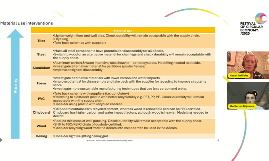 Day 2 of the Festival saw Sarah Griffiths, Associate Director at Anthesis, and Guillermo Mijancos, Construction Manager at McDonald’s, break down how they’re making McDonald’s restaurant interiors circular.